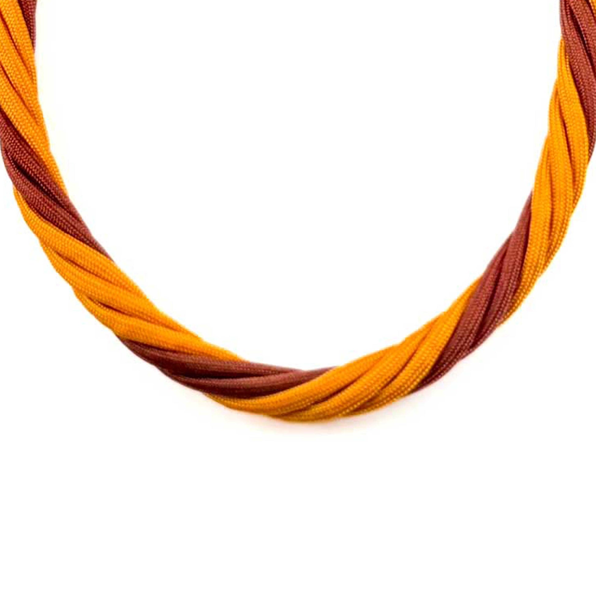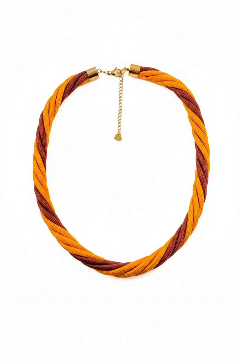 Inspirado en la fertilidad de la tierra y el brillo del sol, el collar representa el equilibrio perfecto entre la naturaleza y el diseño contemporáneo. Su imponente cuerpo torcido mezcla el matiz clásico del carmelita con la energía vibrante del amarillo, logrando una pieza de gran presencia y carácter.