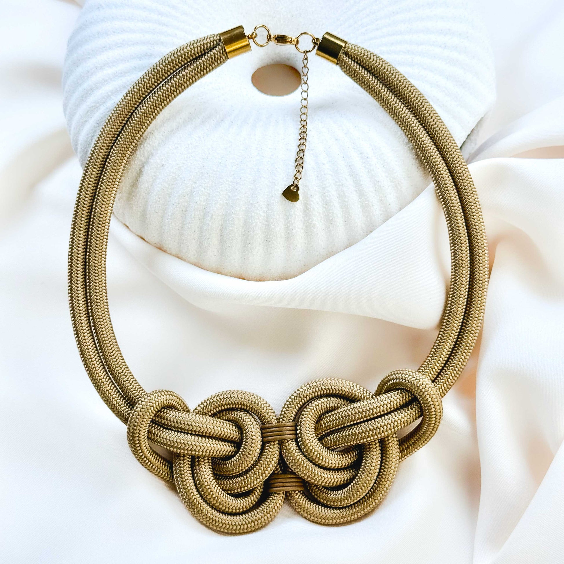 - Material: Cuerda dorada + cuero